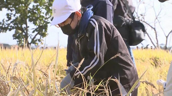 弥生時代の石器「石包丁」使って児童が稲刈り体験 大分