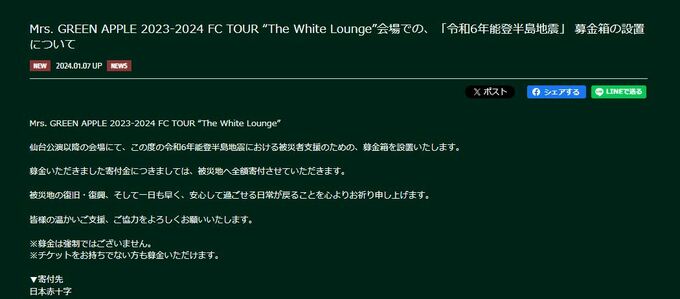 Mrs. GREEN APPLE 【能登半島地震】 被災者支援へ「募金箱」設置 「被災地の復…