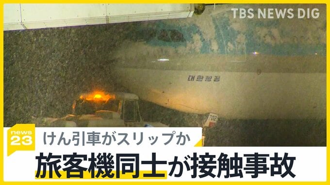 新千歳空港で旅客機同士が接触 大韓航空「日本航空の子会社が運用するけん引車が雪…