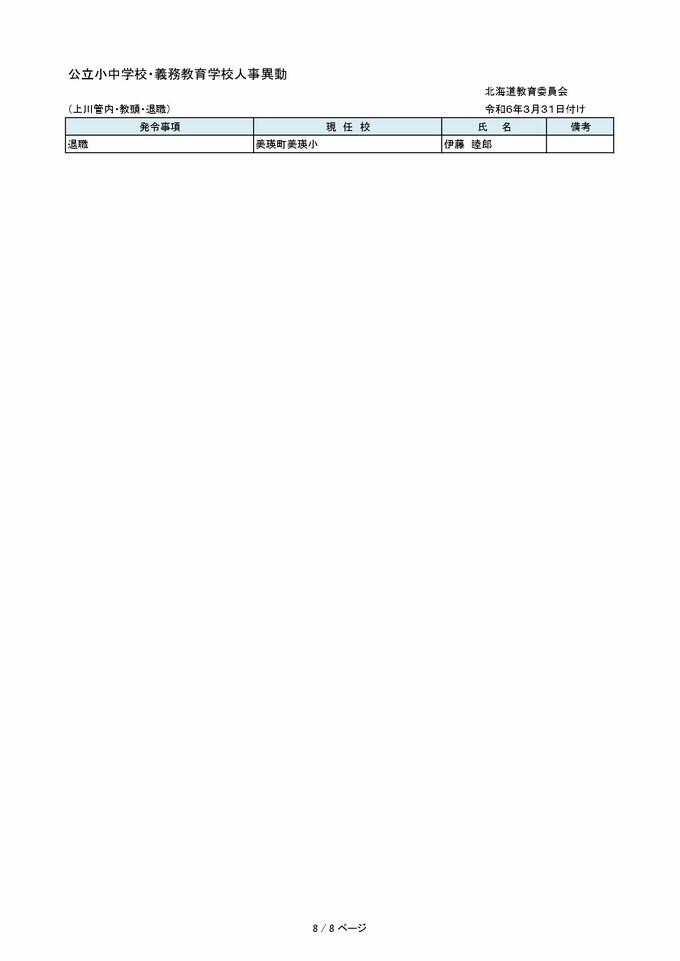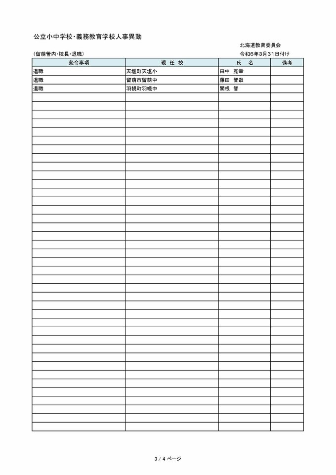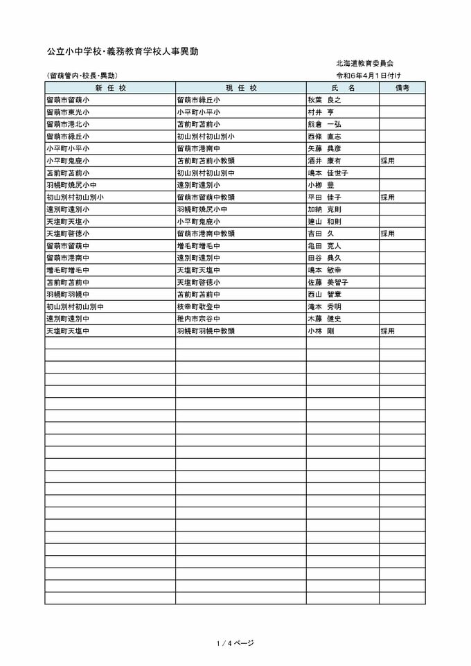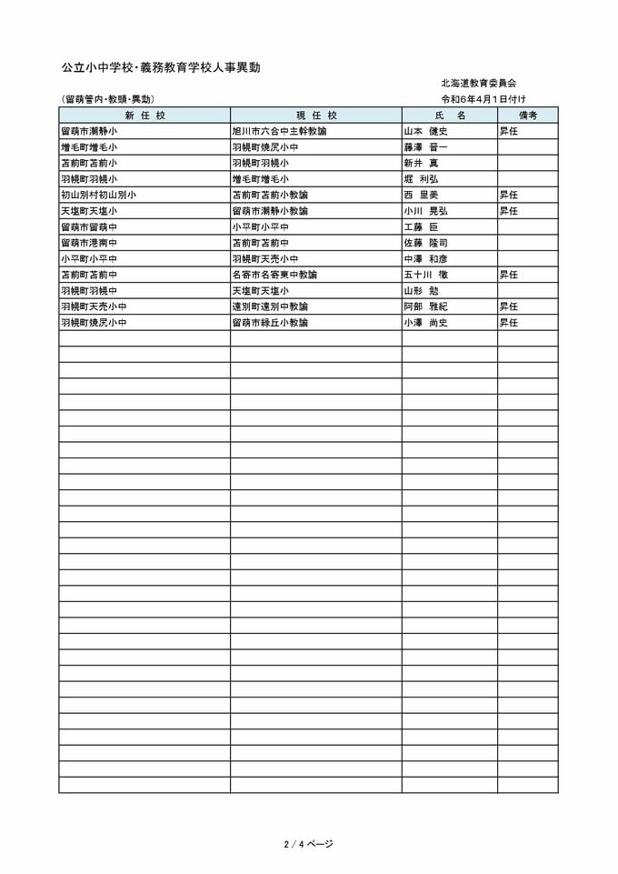 北海道教職員 人事異動2024「あの先生はどこへ?」~小・中学校の校長、教頭など人事異動全名簿(24日発表分) 2024年3月24日(日) 00:00 国内 【檜山管内 公立小中学校・義務教育学校(校長・教頭)】 【上川管内 公立小中学校・義務教育学校(校長・教頭)】 【留萌管内 公立小中学校・義務教育学校(校長・教頭)】