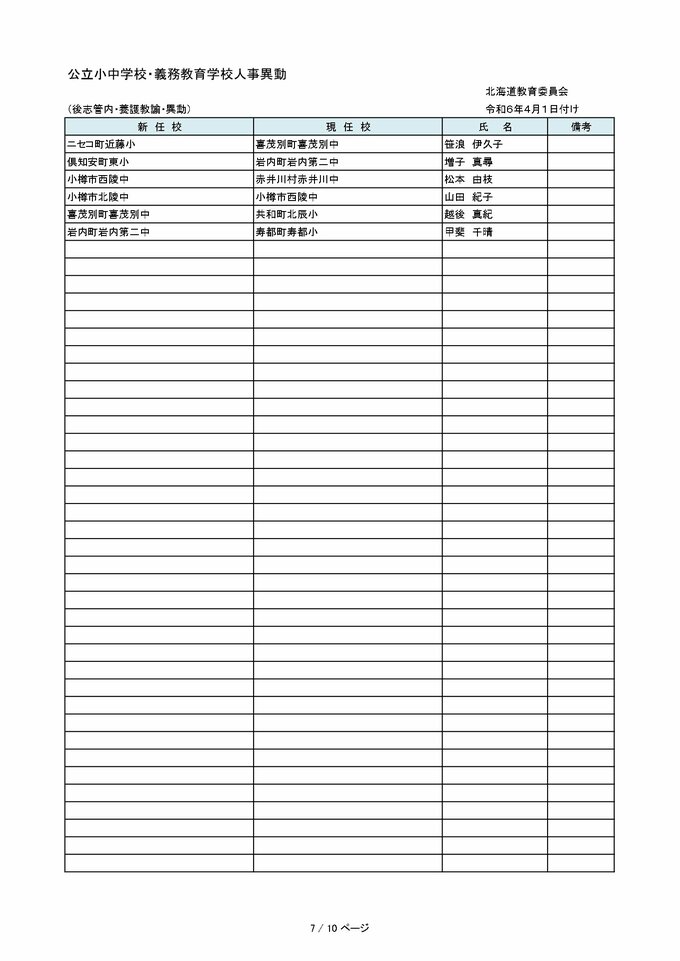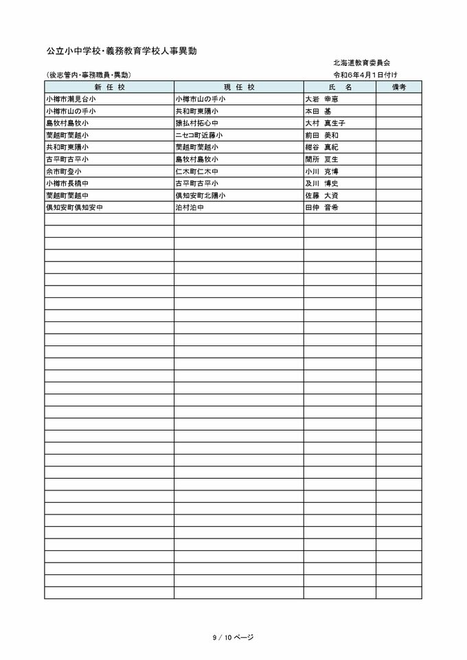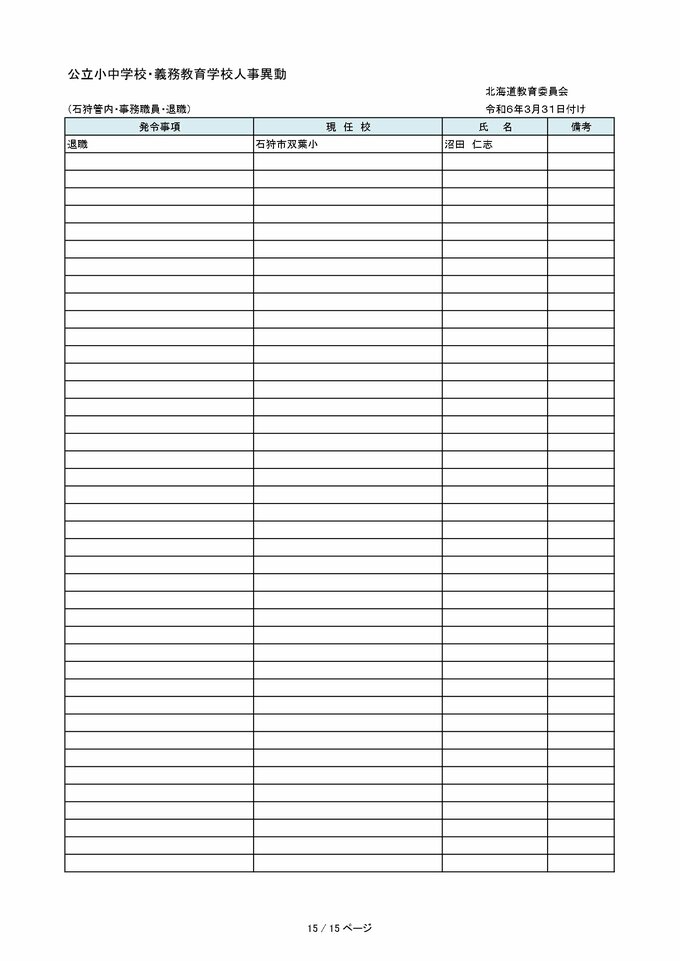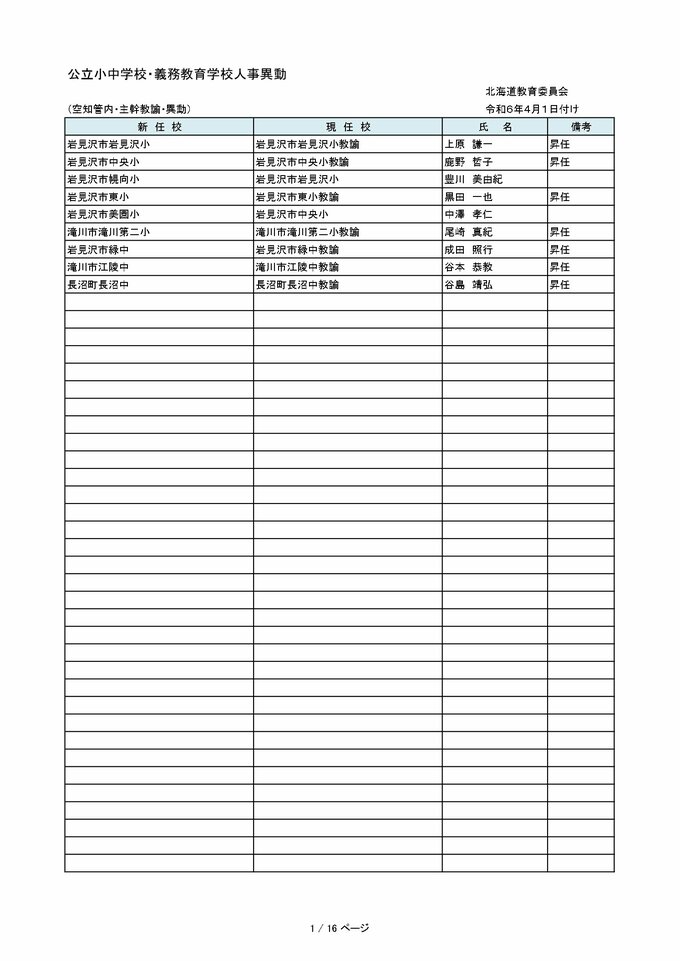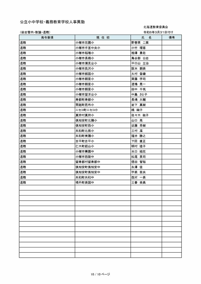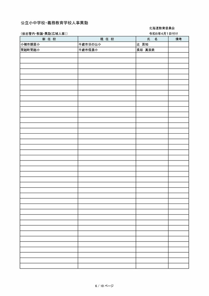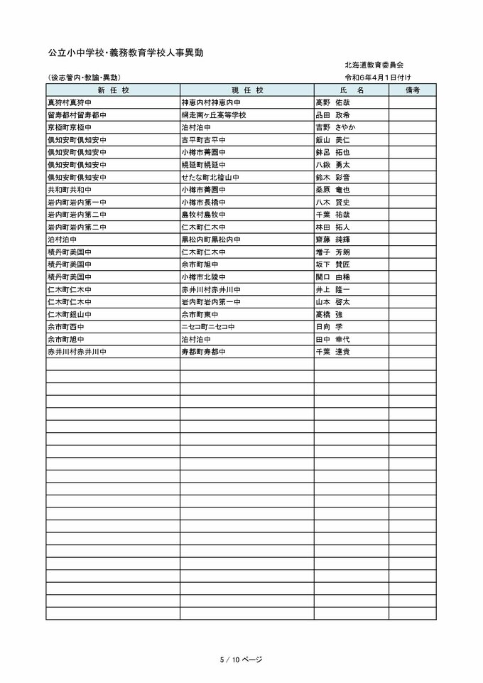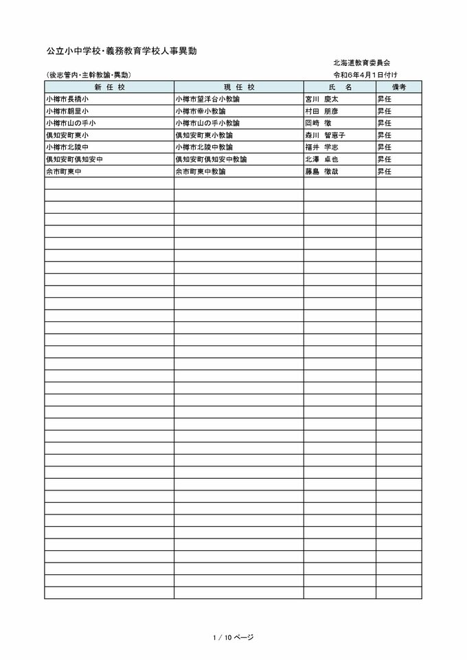 北海道教職員 人事異動2024「あの先生はどこへ?」~小学・中学など異動教職員 全名簿(25日発表分) 2024年3月25日(月) 00:00 国内 【空知管内 公立小・中・義務教育学校(教員・事務職員・栄養教諭ほか)】 【石狩管内 公立小・中・義務教育学校(教員・事務職員・栄養教諭ほか)】 【後志管内 公立小・中・義務教育学校(教員・事務職員・栄養教諭ほか)】