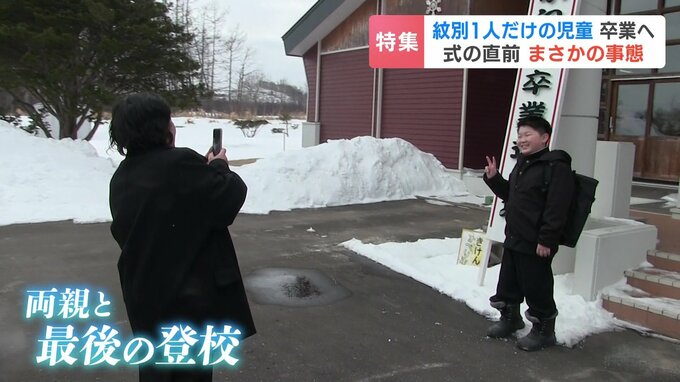 古屋くんは両親と一緒に最後の登校。看板の前で記念写真を撮ります。