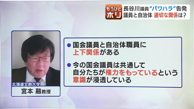 今回の件について、北海道内の政治に詳しい北海道文教大学の宮本教授は、「国会議員と自治体職員に上下関係がある」「今の国会議員は共通して、自分たちが権力をもっているという意識が浸透している」と話していて、そのアンバランスさも今回の件の要因の一つになったのかもしれません。
