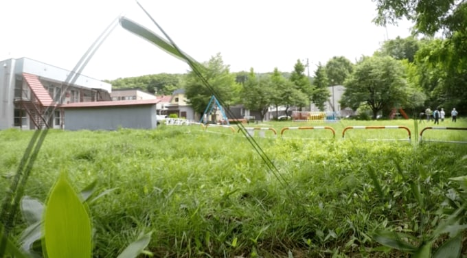 やぶをかき分けて進んでいくと…突然、視界が開けて、公園に出ました。右端には人もいます。