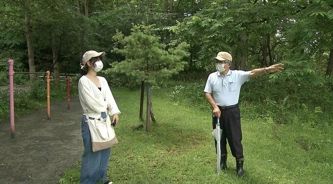 実験中、北海学園大学の宗廣(むねひろ)みことさんは、町内会長の久保専一(くぼ・せんいち)さんに草刈りを企画した経緯を聞いていました。久保さんは、「子どもたちが遊びに来るのに、安全な場所でないと遊べない。10年前にここでブランコに乗っていた子どもたちがすぐそこでクマを見て」と教えてくれました。