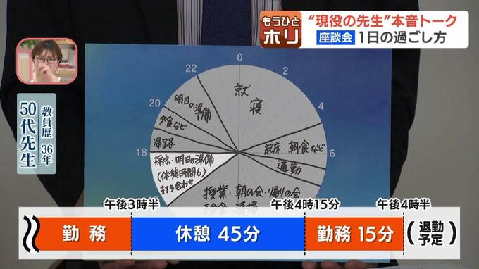 まずは50代のベテラン先生。朝4時半に起きて出勤。就業後、午後3時半まで休みなく働き続けています。