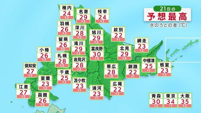 21日の日中の予想最高気温は、20日よりも高い所が多く、沿岸で24℃前後、内陸では28℃前後の所が多くなるでしょう。