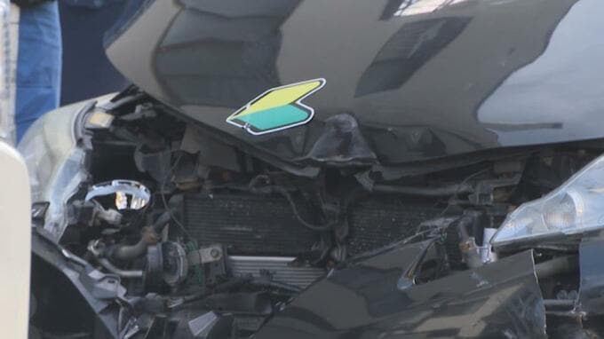 黒の乗用車はフロントがつぶれ、初心者マーク