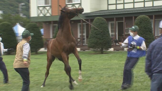 そして迎えた競りの当日。今年は感染予防のための入場制限がなくなり、3年生3人が秦叶と一緒に会場入りできました。高校の敷地の中で育てられてきた奏叶は、238頭のサラブレッドが集まった会場の雰囲気にやや興奮気味。生徒たちは必至で奏叶をなだめます。