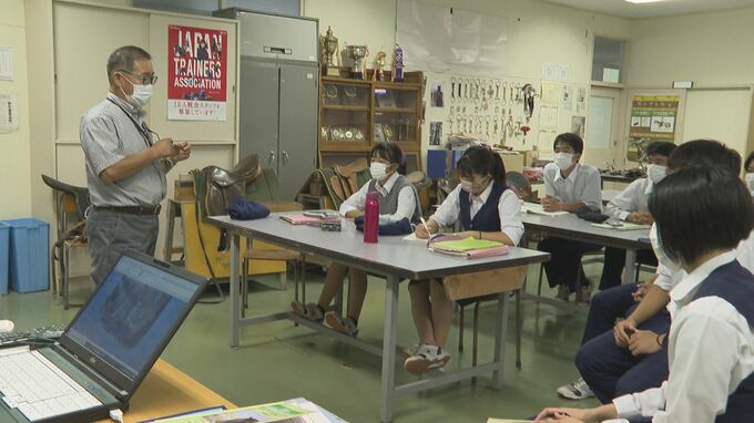 静内農業高校での馬の授業は1978年に始まりました。全校生徒141人のうち生産科学科の馬コースは3年生13人、2年生17人が在籍(馬コースに進むのは2年生から)。学年ごとに1頭の馬を生産から育成、競りに出すまで担当します。より良い環境で馬を育成するための知識や技術を身に着け、乗馬の技術も学べるとあって、毎年全国から生徒が集まります。日本中央競馬会(JRA)のレースで3勝のユメロマン、2勝のゴーゴーヒューガもこの学校の生徒が1歳まで育てました。