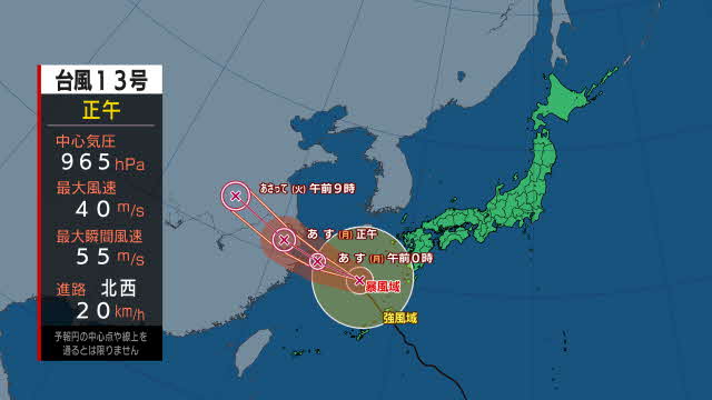 強い台風第13号は、発達しながら東シナ海を北西へ進み、奄美地方から次第に遠ざかるでしょう。奄美地方では、これまでの大雨により土砂災害の危険度が高まっている所があります。土砂災害、低い土地の浸水、河川の増水や氾濫、うねりを伴った高波に警戒してください。【雨・風シミュレーション】