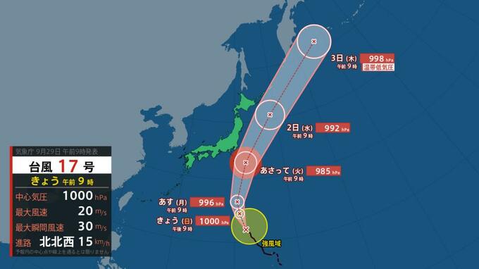 台風第17号は、29日午前9時には、小笠原近海の北緯21度55分、東経141度55分にあって、1時間におよそ15キロの速さで北北西へ進んでいます。
