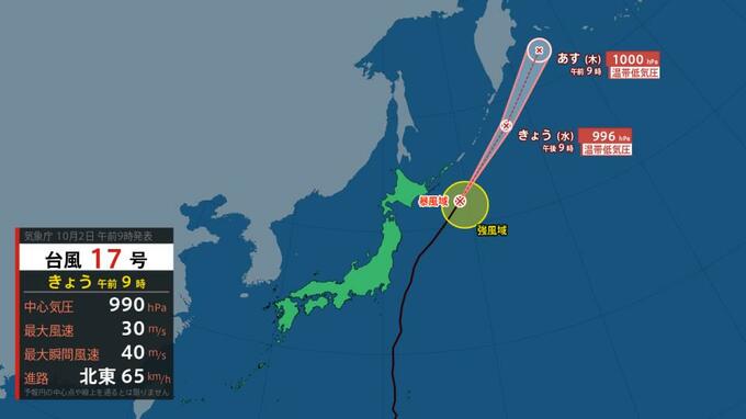 台風第17号は、2日3時には宮古市の東約300キロの北緯39度00分、東経145度25分にあって、1時間に約50キロの速さで北東へ進んでいます。