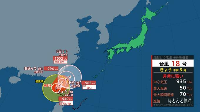 【台風18号】《気象庁が2日午前9時50分発表した実況と予報》