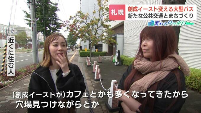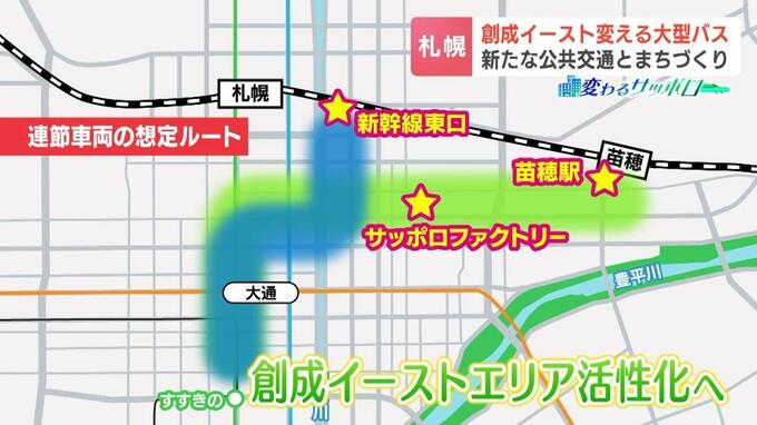 その大型バスで「サッポロファクトリー」、再開発が進む「苗穂駅周辺」、新幹線が乗り入れる「札幌駅」と「大通」、「ススキノ」という2つのエリアとすでにある地下鉄や市電と結びつけることで創成イースト全体の活性化を狙います。