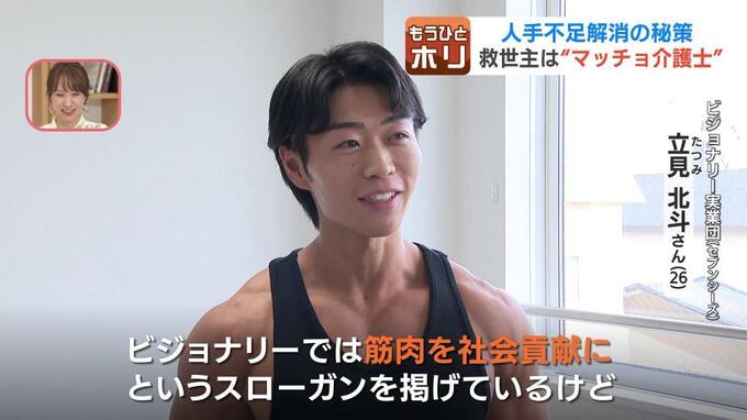 立見(たつみ)さんは、全国の猛者たちが集まる大会でグランプリに輝くなど、国内トップレベルの実力の持ち主。普段は介護士の仕事で、自慢の筋肉を生かしています。