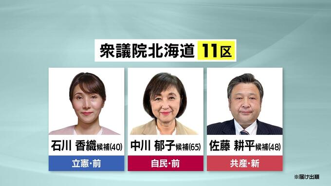 自民 単独過半数割れの可能性も 北海道でも有数の激戦区 北海道11区各候補…「それぞれの不安」 物価高騰対策にはどう取り組む? 2024年10月22日(火) 20:19 国内 投開票日まであと5日となった衆議院選挙。北海道十勝地方が選挙区の北海道11区は、北海道内でも有数の激戦区になっています。北海道11区は届け出順に立憲民主党の前職石川香織氏、自民党の前職中川郁子氏、共産党…