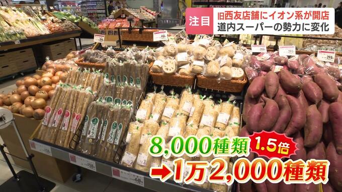 変わる北海道内スーパーの勢力図 西友撤退から約1か月…店舗は順次イオングループに 売上高はトップに躍り出る可能性も 北海道 2024年10月28日(月) 21:21 国内 北海道内でも親しまれてきた西友の撤退から約1か月、店舗を引き継いだイオン北海道は26日、札幌市西区の跡地に新たなスーパーをオープンしました。その戦略とは。この日、店頭に並んだサンマが105円。秋の味覚の…