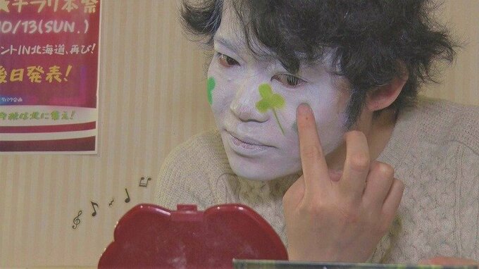 これまでも独創的な格好をして、お客さんを楽しませてきたちかさん。午後7時の開店を前に、おもむろに白のファンデーションを指にとり、顔全体に塗っていきます。