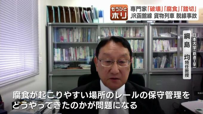 「相当、腐食が進んでいたのではないか。この現場の踏切というのは、レールの底面が見えない状況。目視ではたぶん腐食を判断することは不可能だったのではないか。踏切で、しかも、水がたまりやすい環境があったのではないかと思う。腐食しやすい環境が特別この踏切で発生していたと。腐食が起こりやすい場所のレールの保守管理をどうやってきたのかが問題になる」