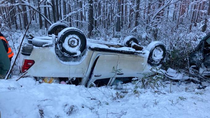 29日午後1時半すぎ、ワンボックスカーとRV車が正面衝突し、それぞれの車が路外に逸脱、RV車は横転しました。付近を走行中の車が119番通報しました。