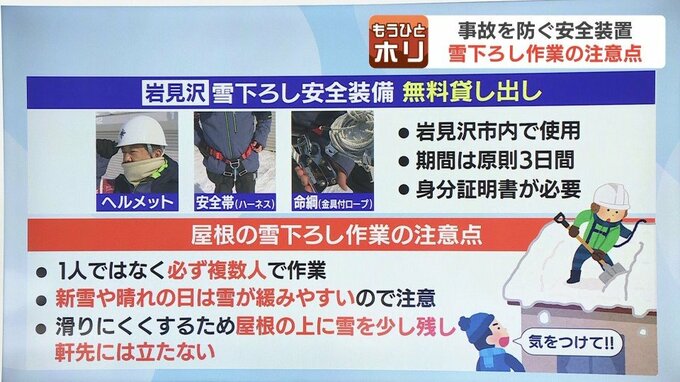 積雪が平年の3倍“異常事態”に除排雪追いつかず交通障害も…事故を防ぐ雪下ろし作業の注意点 北海道岩見沢市 2024年12月17日(火) 20:48 国内 ◆屋根の雪下ろしの注意点 ・1人ではなく必ず複数人で作業をする ・新雪や晴れの日は雪が緩みやすいので注意 ・滑りにくくするため屋根の上に雪を少し残し、軒先には立たない