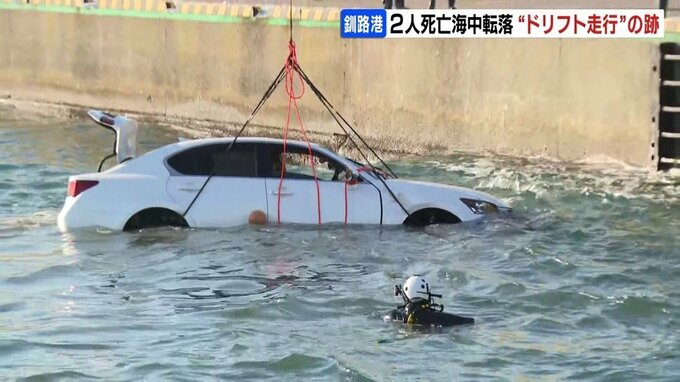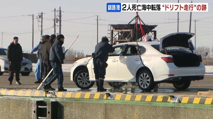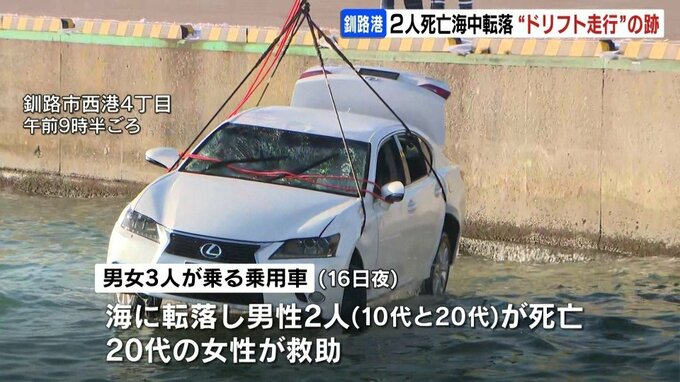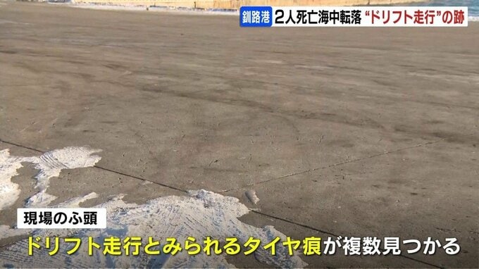 今週16日、北海道釧路市の港で、若い男女3人が乗った乗用車が海に転落し、男性2人が死亡した事故で、現場の港にタイヤを横滑りさせながら走らせるドリフト走行とみられる跡が複数あったことが新たに分かりました。