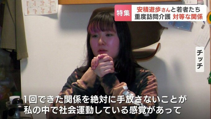 「遊歩さんとのケンカの内容は本当に親子みたい。『何々しなさい』『いや私はこれがしたい』みたいな。でもそれを自分の仕事の利用者(の遊歩)としているというのがすごく面白い。日々重度の身体障害の人と一緒にいて、手を離さないこと、1回できた関係を絶対に手放さないことが私の中で社会運動している感覚があって」