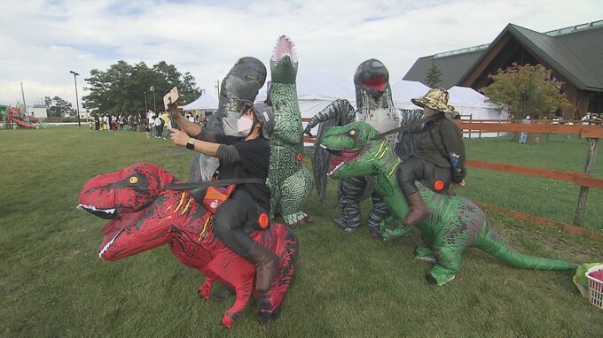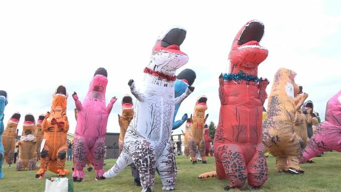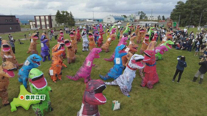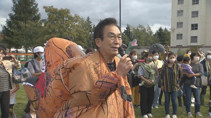 参加者にあいさつする奈井江町の三本英司町長も、ティラノサウルス姿で登場です!