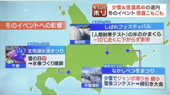雪が少ないため、ジャンボ滑り台を小さくしたり、恒例の雪像コンテストを中止し、アイスリンクを設けて綱引き大会に切り替えるなど対応を迫られています。