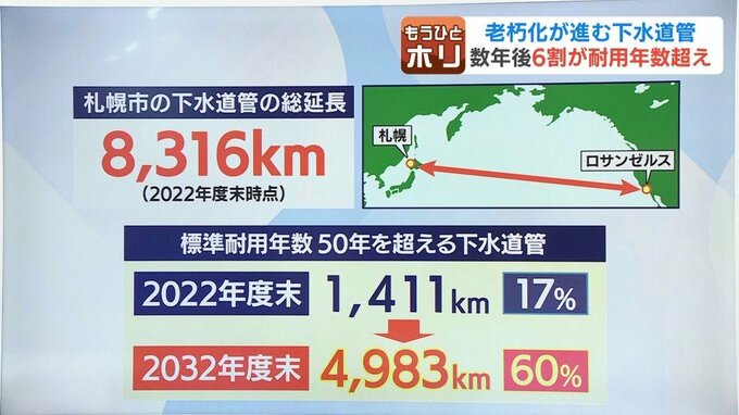 下水道管の標準耐用年数は、約50年とされていて、札幌市の場合はどうなのでしょうか。札幌市の下水道管の総延長は、約8300キロ。これは札幌市からアメリカ・ロサンゼルスまでの距離に匹敵します。