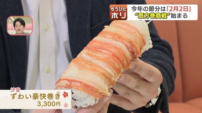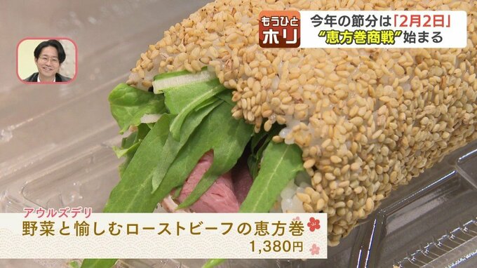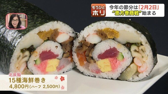 野菜とローストビーフの恵方巻に、マグロやタイなど15種の海鮮が入った恵方巻。