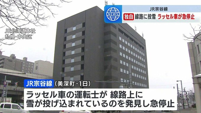 JR北海道によりますと、1日午後1時ごろ、美深町のJR宗谷線で除雪作業をしていたラッセル車の運転士が、線路上に雪が投げ込まれているのを見つけ、急停止しました。