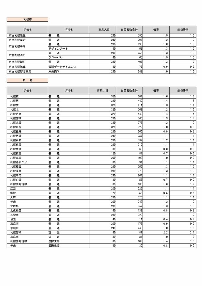 【公立高校入試】出願変更後の最新状況 全日制普通で札幌平岸1.8倍が最高倍率 札幌東と札幌国際情報が1.6倍、市立札幌旭丘と苫小牧東1.5倍、札幌南は1.3倍、札幌西1.4倍、札幌北1.2倍(全日・定時全校一覧) 2025年2月12日(水) 15:43 国内 【全日制】 ◇札幌市・石狩・空知