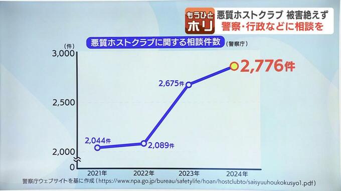 全国の警察署におけるホストクラブに関する相談件数です。2021年は2000件ほどでしたが、この3年で2776件まで増えています。この3年ほどで、1.4倍に相談件数は増えています。