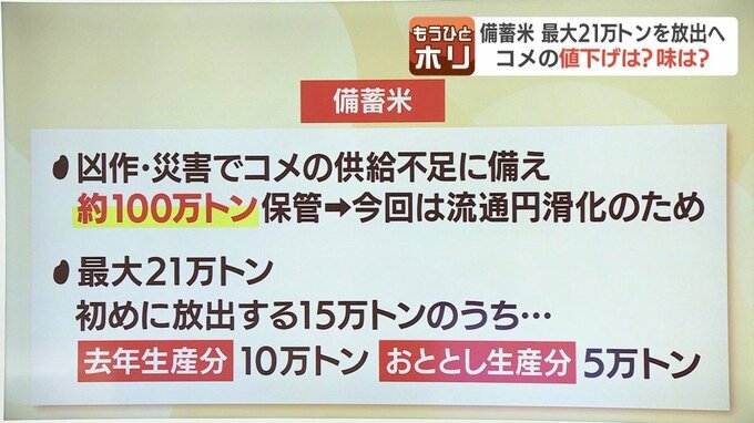 政府は、備蓄米を最大21万トン放出するとしていて、はじめに放出される15万トンのうち、10万トンは去年、生産されたコメです。残りの5万トンは、2年前に生産されたコメとなっています。