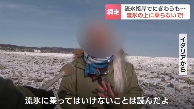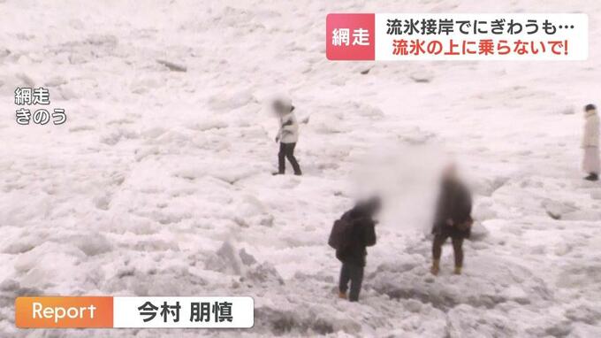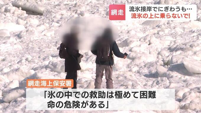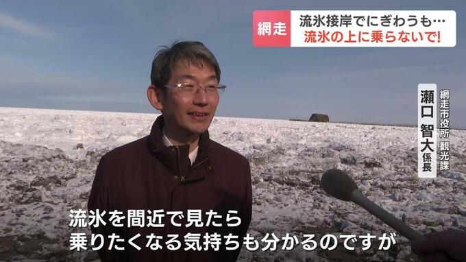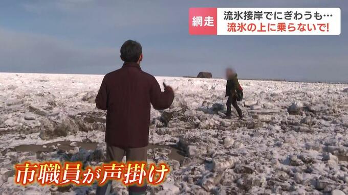 網走市の職員が海岸を回って、流氷に乗らないよう、観光客に声をかけています。網走市では5年前に、流氷に乗った大学生が沖に流される事故も起きています。