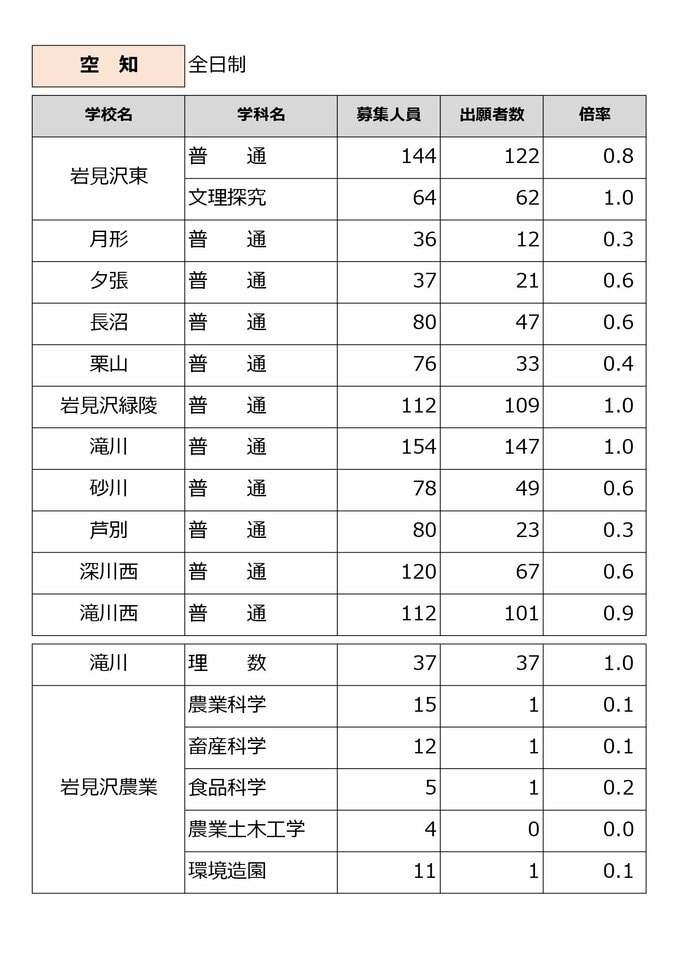 北海道公立高校入試2025年【志願倍率確定】札幌南1.3倍 札幌西1.4倍 札幌東1.6倍 札幌北1.2倍 全日制普通科で最高は市立札幌清田のグローバル1.9倍 試験は3月4日《全日・定時制全校掲載》 2025年3月3日(月) 13:09 国内 【全日制】空知・胆振・日高