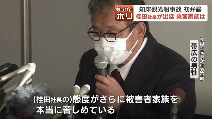 意見陳述で帯広市の男性が「冷たい海水が迫る中、大人でも怖い状況なのに、7歳の息子は船体が傾く中で言い表せない恐怖だったと思う。桂田氏は恐怖や無念の気持ちをどう考えているのか」と涙ながらに述べると、桂田社長は終始うつむいた様子でその言葉に耳を傾けていました。