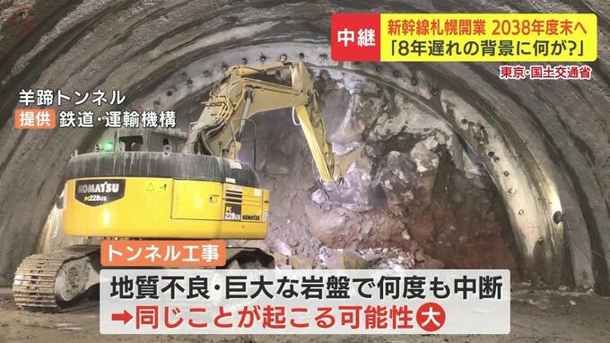 今後は有識者会議の座長が“報告書案”の修正を行うとして、新たな札幌延伸の開業年は明示されませんでした。遅れの一番の原因は、工事区間の8割を占めるトンネル工事です。『渡島トンネル』や『羊蹄トンネル』で、地質不良や巨大な岩盤が見つかったことで、工事は何度も中断しました。