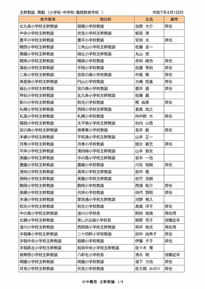札幌市教職員 人事異動2025「我が恩師はどこへ?」~25日発表分(札幌市立幼・小・中・義務教育学校の教員ほか) 2025年3月25日(火) 00:00 国内 【札幌市立幼稚園・小・中・義務教育学校(教諭・事務職員・栄養教諭ほか)】
