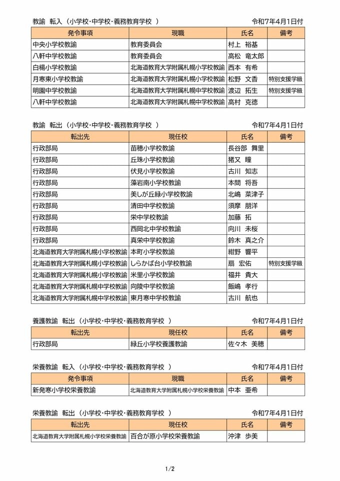 札幌市教職員 人事異動2025「我が恩師はどこへ?」~25日発表分(札幌市立幼・小・中・義務教育学校の教員ほか) 2025年3月25日(火) 00:00 国内 【教諭 転入(小学校・中学校・義務教育学校)】