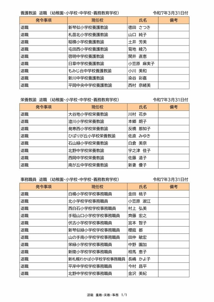 札幌市教職員 人事異動2025「我が恩師はどこへ?」~25日発表分(札幌市立幼・小・中・義務教育学校の教員ほか) 2025年3月25日(火) 00:00 国内 【養護教諭 退職(幼稚園・小学校・中学校・義務教育学校)】 以上25日発表分