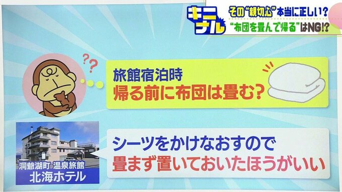 洞爺湖町の温泉旅館「北海ホテル」によりますと、「畳まずに置いておいた方がよい。一度すべての布団をよけて、きれいにしてシーツをかけなおすので、ぐちゃぐちゃでもいいからそのままの方が楽」ということでした。