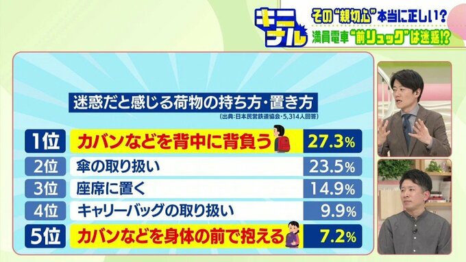 日本民営鉄道協会のアンケートによりますと、1位に「カバンなどを背中に背負う」が入っていますが、5位には「カバンなどを身体の前で抱える」が入っています。