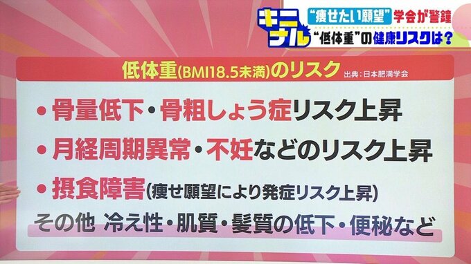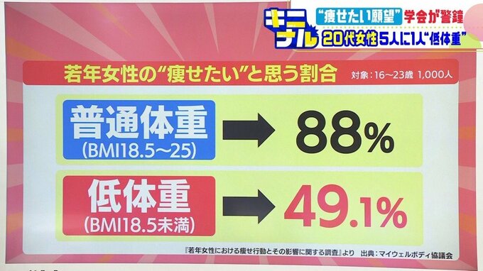 すでに低体重(BMI18.5未満)であっても「痩せたい」という欲求がある女性は約5割に上るということです。
