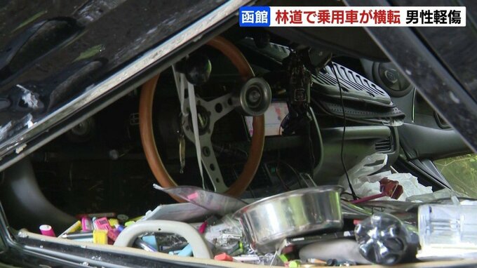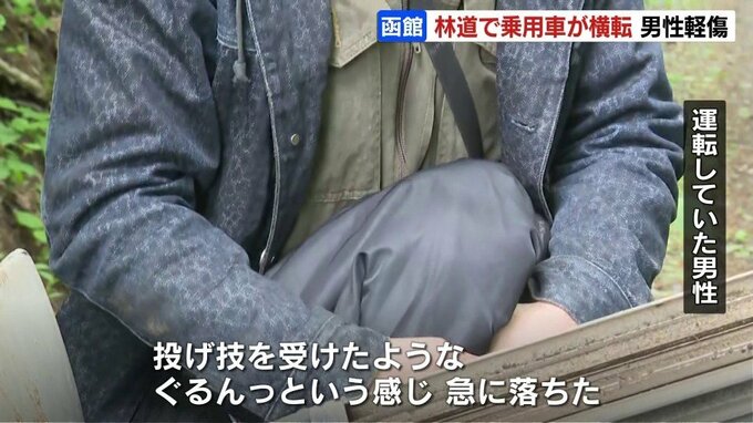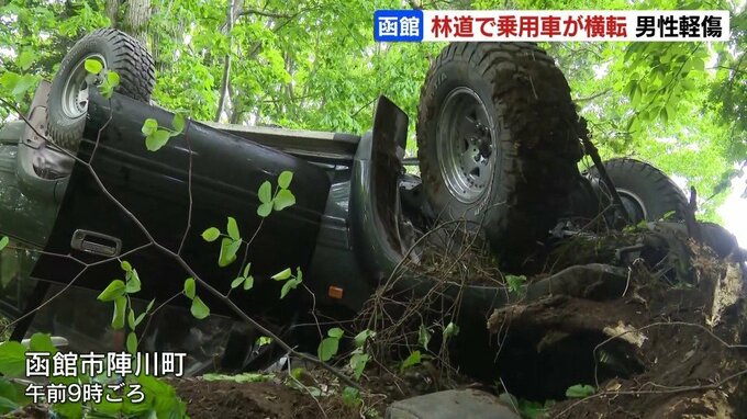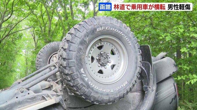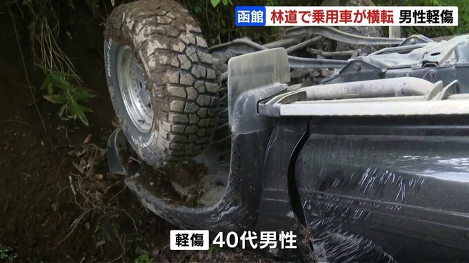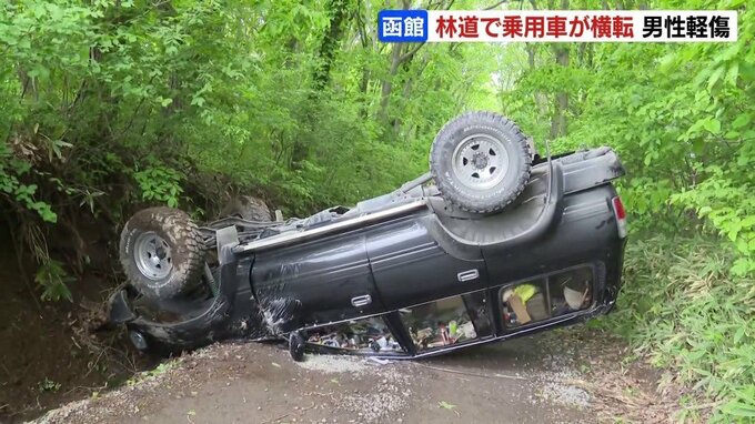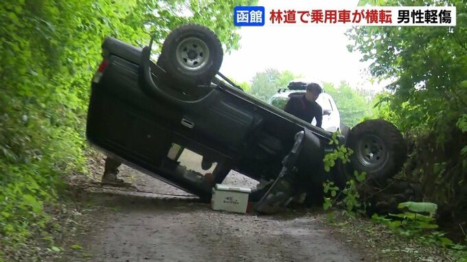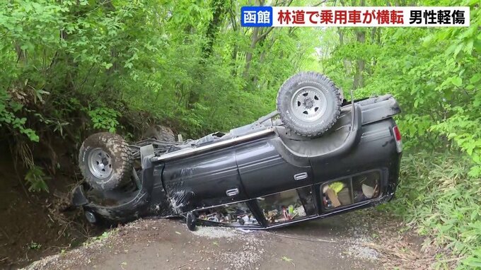 27日朝、北海道函館市の林道で、乗用車が横転し、運転していた40代の男性が軽いけがをしました。