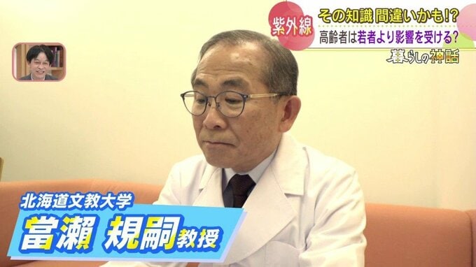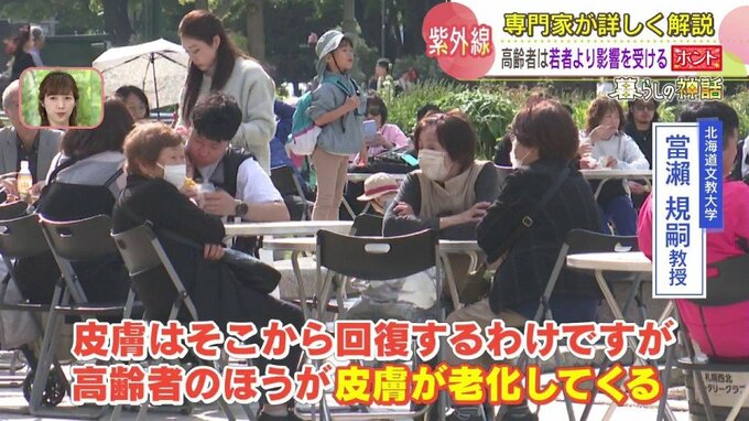 「お年寄りも若い方も、影響の度合いは同じくらい。だけどそこから皮膚は回復するわけですけど、高齢者の方が、皮膚が残念ながら老化してくるんですね。そうすると、皮膚って少なからず(紫外線で)ダメージを受けるんですけど、そのダメージから回復する能力が落ちてくるんですね。それでそのダメージが皮膚に蓄積しやすくなると、皮膚のダメージがたまってくるとガンとか起こりやすくなります」