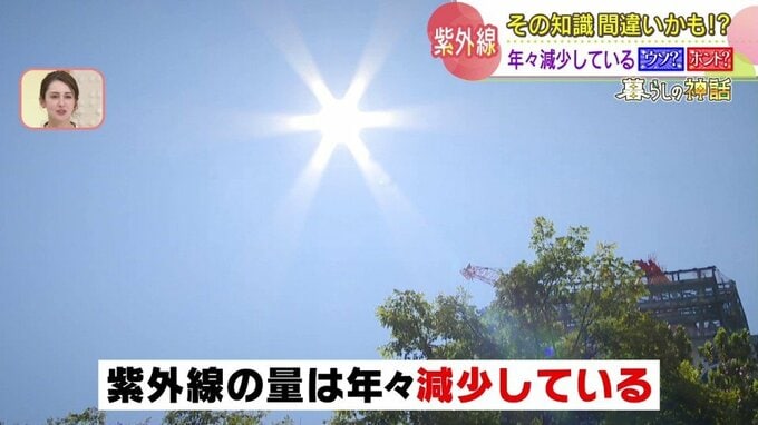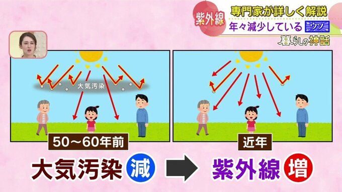 「紫外線の量はむしろ少しずつ増えているのではないか。紫外線が測れるようになったのはここ50、60年ぐらいなので、大気汚染がたくさんあったころで粉塵とか物質がいっぱい漂っていた時代だったので、そういう時って紫外線がそれにぶつかって、地上まで落ちてこないんですよ。それが今、公害とか大気汚染とかの対策が進んできて、空気が澄み切ってきているので、太陽からの紫外線が増えたというワケではなくて、途中でカットされる紫外線の量が減った」