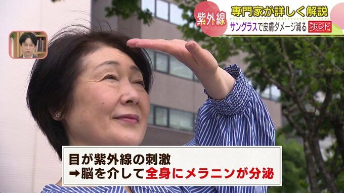 「目の中に紫外線が入ってくるのは、通常当たり前に入ってくるんですけど、その紫外線が網膜に影響すると、脳の神経を介してですね皮膚にメラニン色素をたくさん作れと命令がでることに。(体)全部をカバーして目にだけ紫外線を当てても、色は黒くなるっていうのは人間の仕組みにあるんですね」
